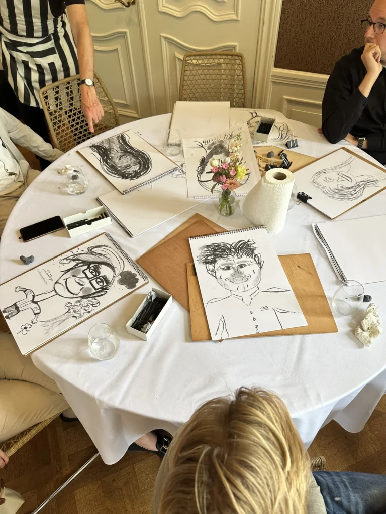 Daarna was het tijd voor de eerste workshop: karikatuur tekenen. En nee, je hoefde echt geen Rembrandt te zijn – alleen een beetje zelfspot was vereist 😉 Onder de bezielende en humoristische leiding van Hugo gingen we aan de slag met pen en papier. De hele groep deed fanatiek mee en het leverde niet alleen verrassend creatieve portretten op, maar ook veel gelach en leuke gesprekken. Uiteindelijk ging Jesse er met de winst vandoor met zijn geweldige karikatuur van Maarten (JAM) – een echt meesterwerk!