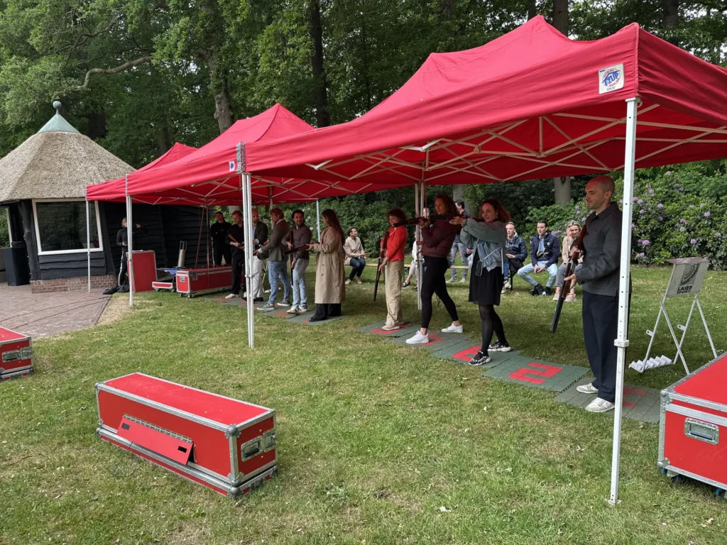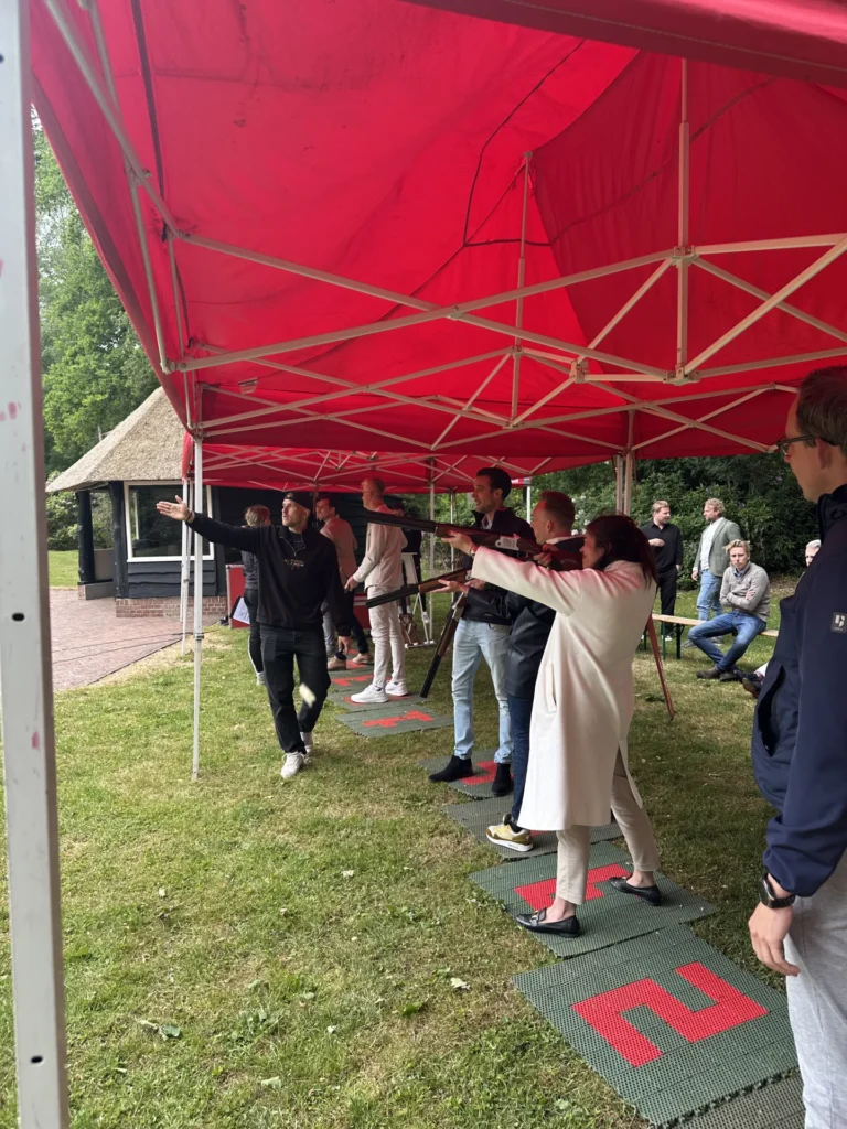 Na de kunst kwam de actie. We trokken naar de bos voor de workshop laser kleiduifschieten. Na een korte oefenronde werd het serieus: wie had het scherpste vizier? In groepjes van 7/ gingen we de strijd aan, terwijl het scorebord alles haarfijn bijhield. Spannend én hilarisch! Uiteindelijk was het Daan van Verbunt Verlinden die als winnaar uit de bus kwam. Scherpschutter van de dag!